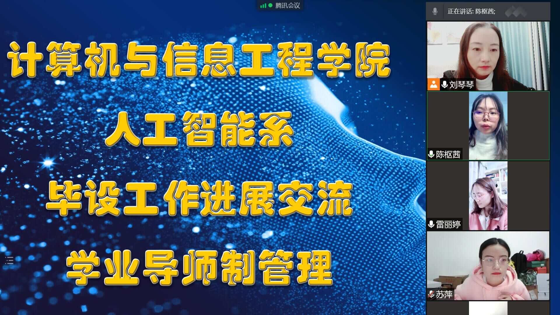 毕设方面刘主任向各位教师了解选题情况,确定各教师均已制定好毕设课题。安排两个教研室整理出所有毕设材料的空白模板共享到毕设群中,供学生使用。刘主任还在人工智能系部群中分享了“毕业生实习跟踪与毕设统计在线表”供各教师参考,建议各指导教师至少每周让学生填写更新毕设进展,教师及时给予反馈了解学生动向。