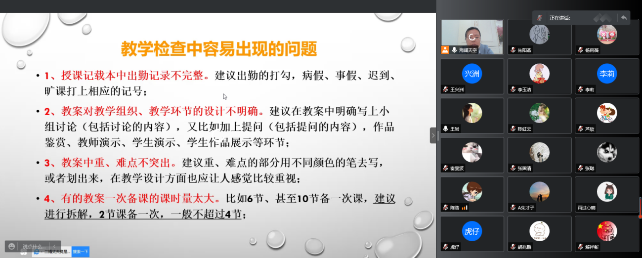 11月25日晚,我院网络工程教研室与计算机科学与技术教研室以“期中教学检查工作”为主题,联合开展腾讯在线教研活动。本次活动由网络工程教研室主任熊芳芳主持,计算机科学与技术教研室主任杨雨薇以及网络工程教研室与计算机科学与技术教研室的教师参加会议。 熊芳芳主任从以下方面强调期中教学检查相关工作:1、从11个方面详细分析以往在教学检查中出现的问题,并对相关问题提出建议;2、强调教师听课,有利于教师之间互相学习,相互取长补短,共同提高,共同前进,有利于青年教师学习优秀教师的先进教学经验,有利于促进教学改革的深入;3、强调日常教学规范化,如至少提前10分钟到教室,按时上下课,不得随意调课等。 最后参会教师进行了深入的交流,分享和讨论在期中教学检查中目前的进度及相关工作的开展情况。熊主任最终表示希望通过此次期中教学检查教研活动,能够让各位老师在以后的教学工作中避免出现类似的错误,顺利完成教学活动,并希望各位老师能沉下心来,踏实工作,认真落实教研室各项工作任务,认真负责、团结互助,打造良好的教研室环境。