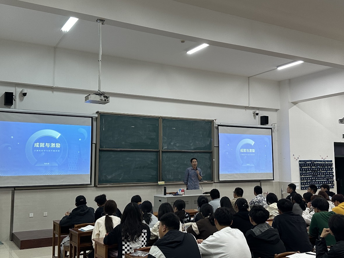 2023年10月10日,计算机科学与技术教研室海安校区举办新生大讲堂,由张庆虎老师给计算机科学与技术专业大一新生开展题为《成就与激励》的讲座,计科2023届4个班的160多名新生参加了讲座。