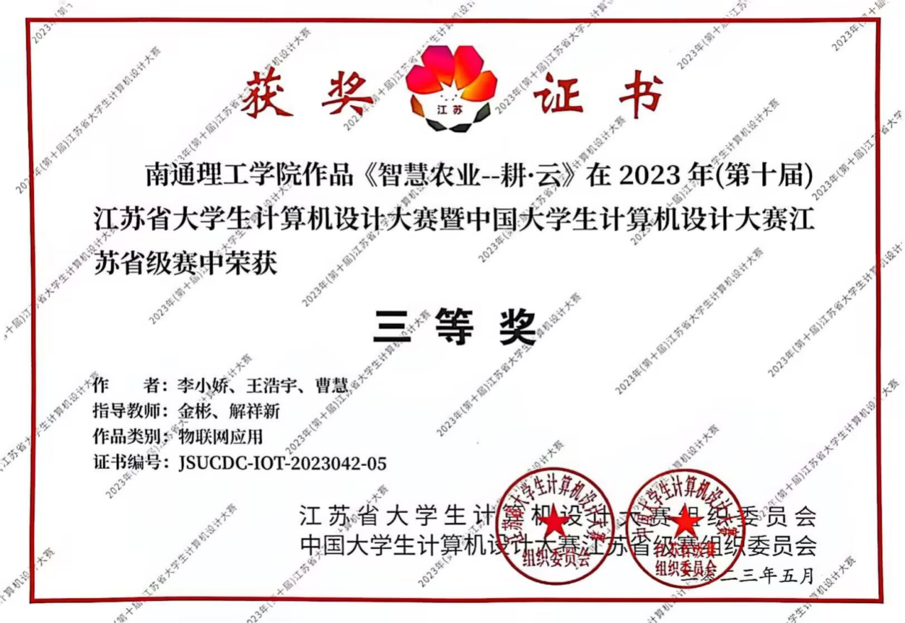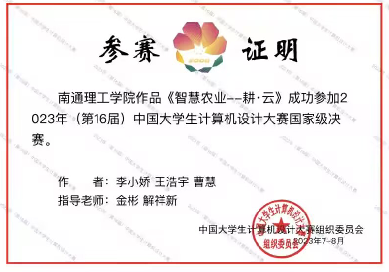2023年5月27日,(第16届)中国大学生计算机设计大赛东南大学赛区(物联网应用类、数媒动画与短片类),由东南大学承办线上省赛,由我院金彬、解祥新老师指导,数媒2103李小娇、工程2101曹慧、工程2101王浩宇设计的作品《智慧农业—耕·耘》在省赛中荣获三等奖。2023年8月13日~8月17日,(第16届)中国大学生计算机设计大赛厦门决赛区(物联网应用类、数媒动画与短片类),由厦门大学承办线上决赛。本届赛事中,江苏赛区90所学校参加了比赛,共提交了近1470件作品,在经过了省赛阶段的角逐,共评选出480件作品上推国赛。经过激烈角逐,由我院金彬、解祥新老师指导,数媒2103李小娇、工程2101曹慧、工程2101王浩宇设计的作品《智慧农业—耕·耘》经省赛选拔后不断修改完善,最终在国赛中荣获物联网应用类成功参与奖。