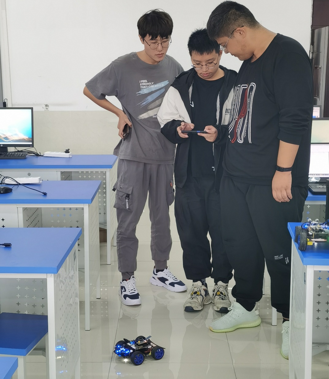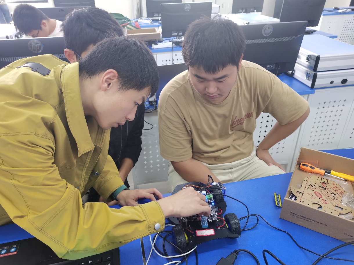 在近一周的培训时间里,培训老师以智能车硬件为基础,讲解了点亮LED灯、七彩灯闪烁、点亮呼吸灯、小车的方向驱动(前后左右走自转)和小车的红外避障等控制功能模块。培训过程中注重学生动手能力的培养,老师手把手教学,确保每个同学能够实现智能车的相关控制功能。