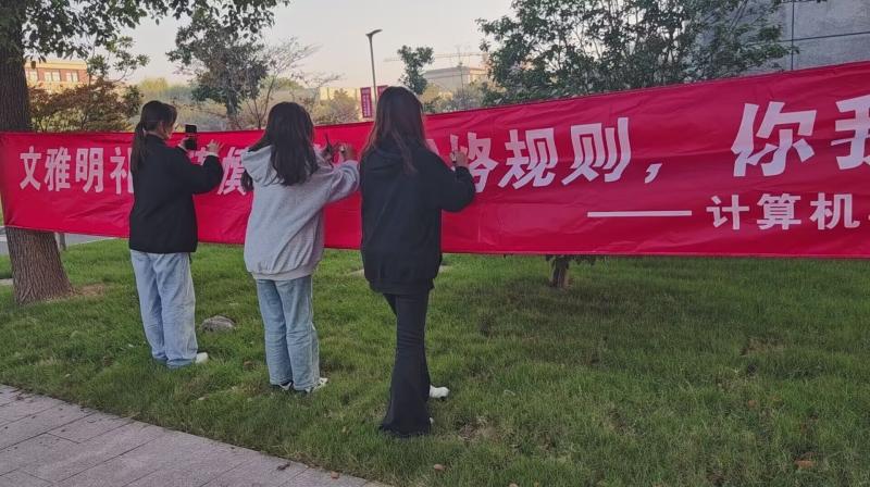 11月14日,我院于厚德楼外西侧开展“网络非法外之地,人人需遵守网络规则”横幅签名活动,参与本次活动的有我院副院长朱长永以及全体同学。本次活动由朱长永主持。