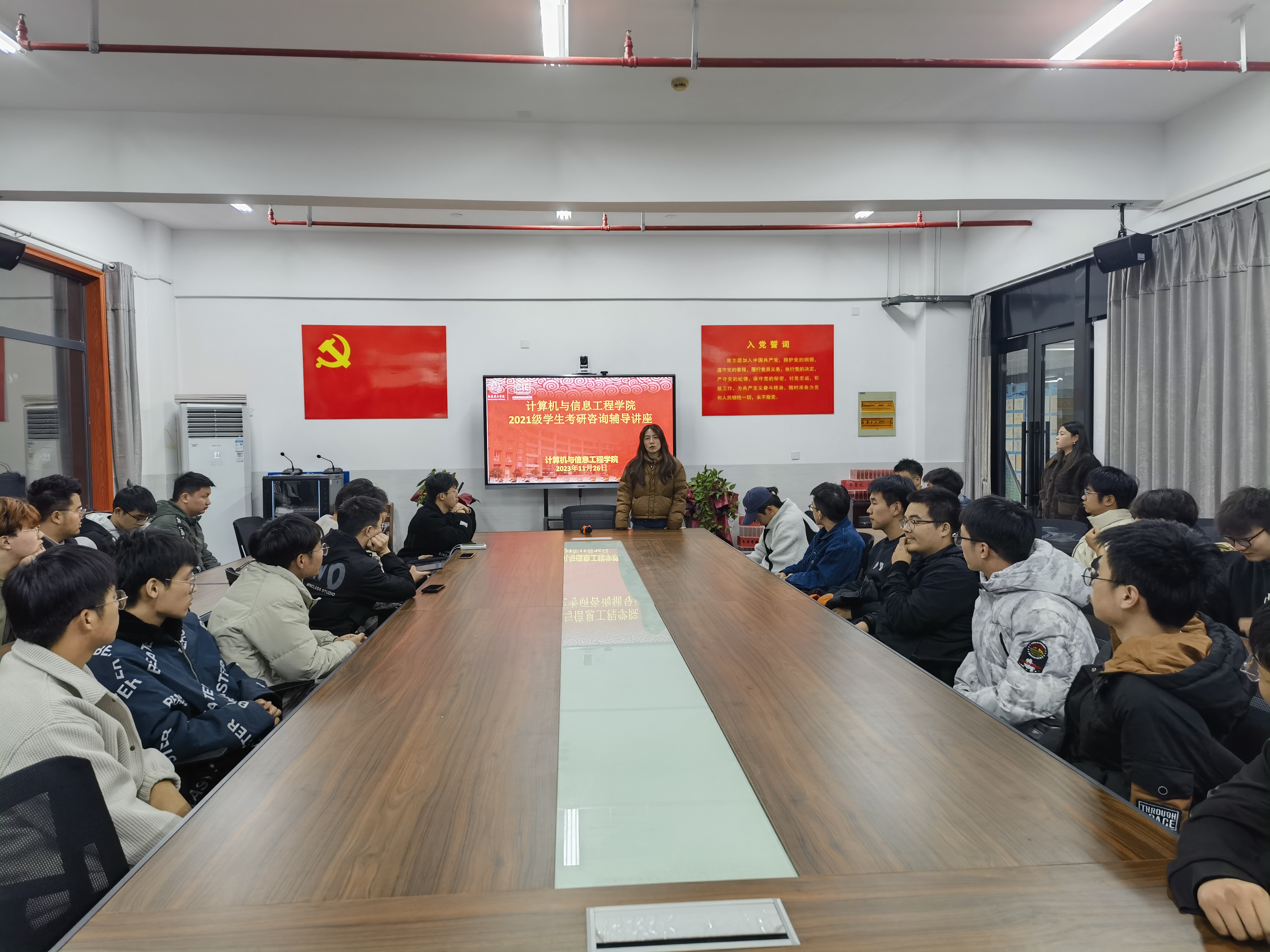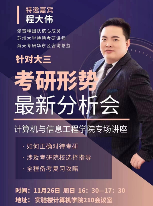 2023年11月26日下午在实验楼210会议室召开学院2021级学生考研咨询辅导讲座,邀请到张雪峰团队核心成员、海天考研华东区咨询总监程大伟老师进行咨询辅导讲座,学院副书记副院长卢曦主持会议,学院2021级南通校区有考研意向的同学参加活动。