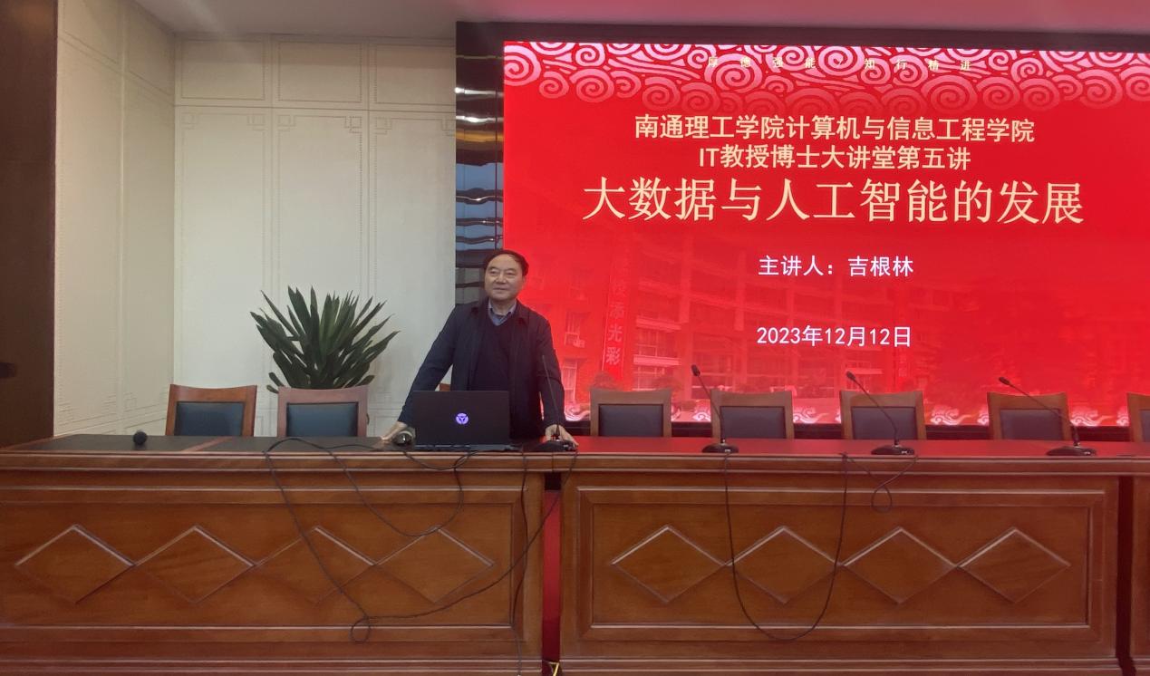 12月12日,bwin必赢在南通校区图书馆天南厅举办“IT教授博士大讲堂”第五讲,邀请南京师范大学计算机与电子信息学院原院长吉根林教授为嘉宾,做题为“大数据与人工智能的发展”的学术讲座。本次活动由院党总支副书记副院长卢曦主持,2021级学生代表及全体辅导员参加。
