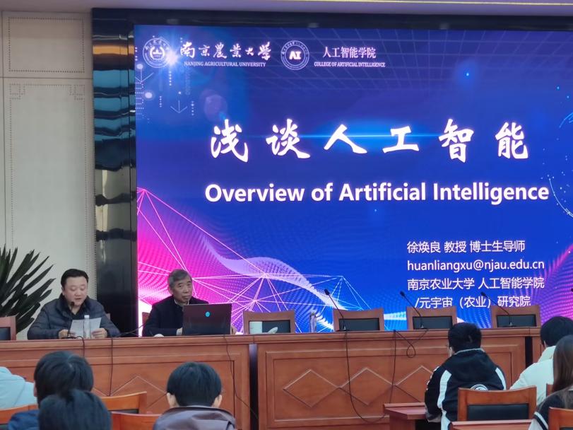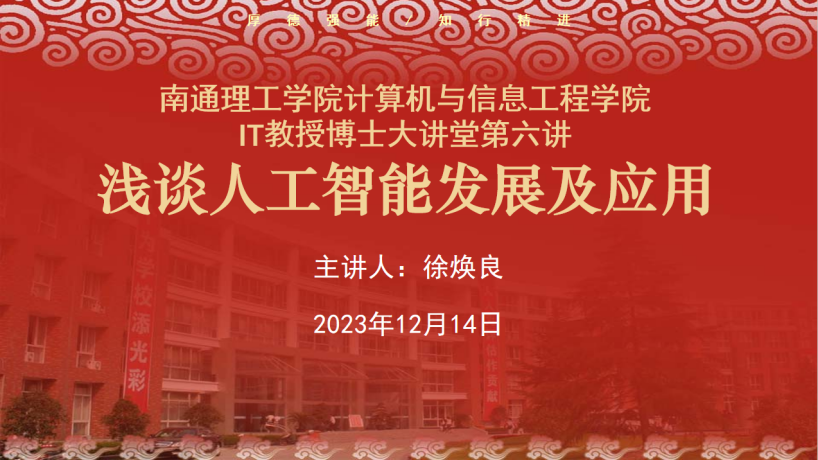 12月14日,bwin必赢在南通校区图书馆天南厅举办“IT教授博士大讲堂”第六讲,邀请南京农业大学人工智能学院原院长徐焕良教授为嘉宾,做题为“浅谈人工智能发展及应用”的学术讲座。本次活动由副院长张海飞主持,2021级学生代表及全体辅导员参加。