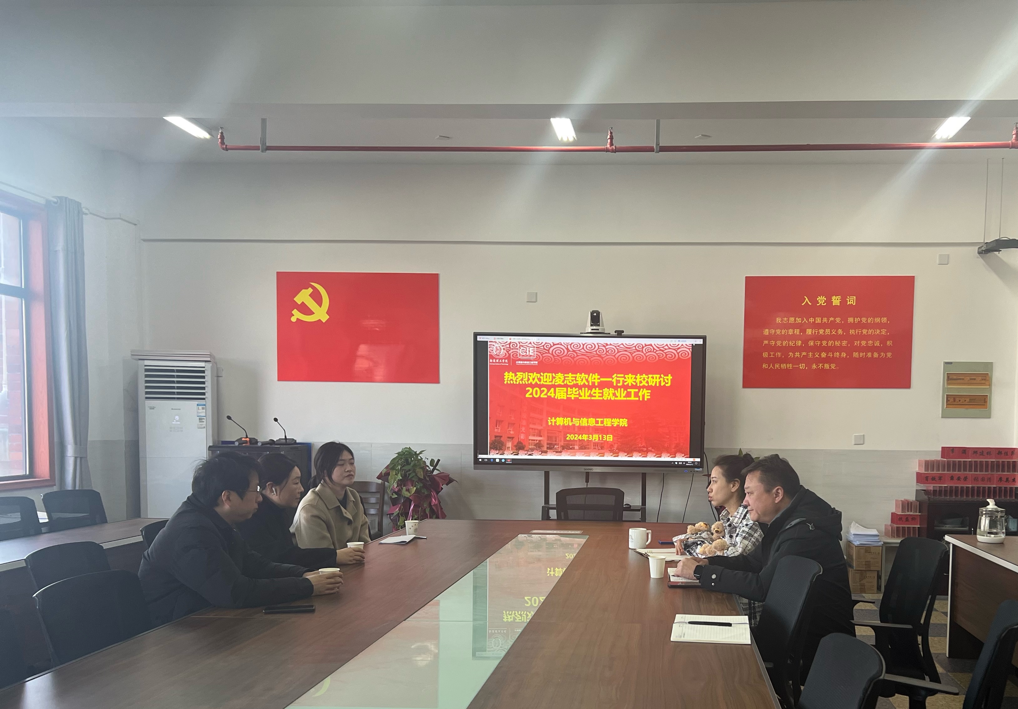 为拓宽毕业生实习和就业渠道,3月13日,我院邀请校企合作单位凌志软件股份有限公司来院进行就业工作研讨,本次会议在新实验楼会议室210召开,参加本次会议的有院副院长张海飞、院就业办公室主任徐畅、辅导员俞晨晨及凌志软件人力资源总监沈利忠一行人。