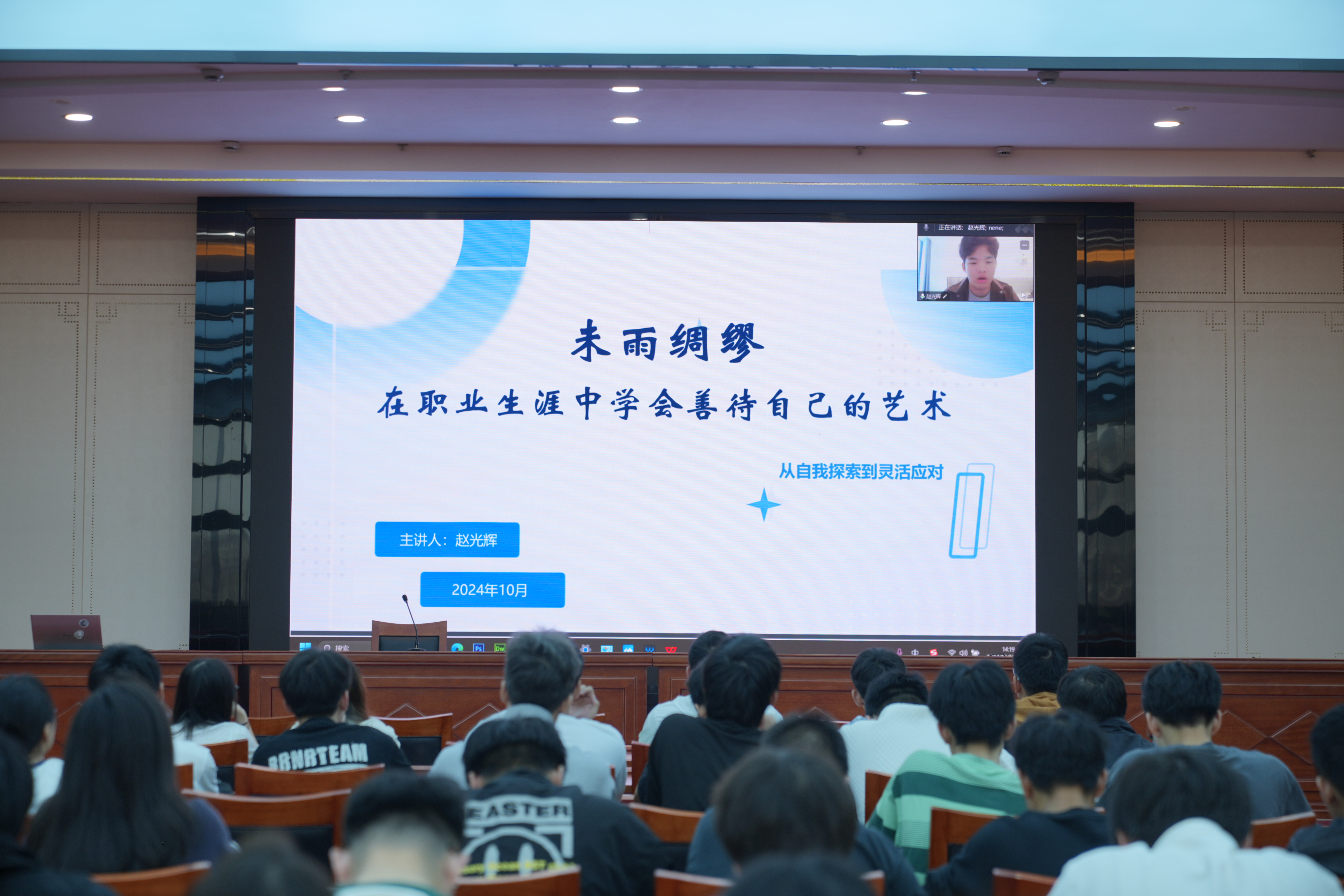 讲座上,赵光辉围绕“未雨绸缪”、“艺术的善待自己”、“构建支持网络”三个方面进行分享。他提出,提前规划职业生涯对于认清自我价值、应对就业压力、减少未来不确定性至关重要,同学们可以从行业探索、自我评估、目标设定三个方面进行职业生涯规划。同时,他认为善待自己,关注尊重自身情感需求,培养积极的生活态度是职业生涯成功的关键。赵光辉还建议同学主动建立人脉网络,拓展外部资源,为获得就业机会、把握行业机遇、未来职业发展奠定坚实基础。此外,他还结合自身实习工作经历,分享了简历制作、面试以及实习心得。在最后的交流互动环节,他全面解答了同学们在求职阶段将面临的问题,鼓励同学们保持乐观的心态,乘风破浪,勇敢追寻职业目标。