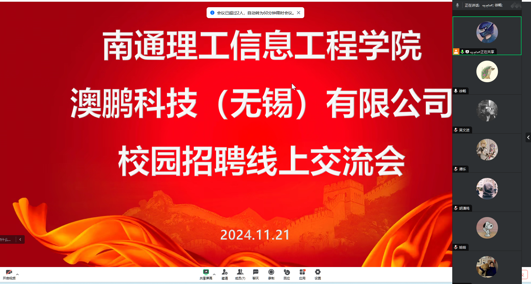 2024年11月21日开展澳鹏科技(无锡)有限公司(以下简称“澳鹏科技”)线上专场招聘会,2024届部分未就业同学,2025届部分毕业生参加此次招聘会。