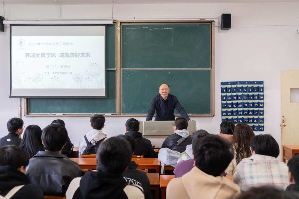 学风建设在高等教育中地位举足轻重,深刻影响学生学业、成长与职业发展。2024 年 11 月 27 日下午,电信 2202 班在班主任章国安院长的带领下,召开学风建设主题班会,力促浓厚学习氛围形成。 章国安在班会上强调,要坚定理想信念,树立共产主义远大理想与中国特色社会主义共同理想,增进对党的信赖、对中国特色社会主义信心以及对马克思主义信仰,此为同学们提供精神支撑,使其在学术与人生追求中信念坚定。